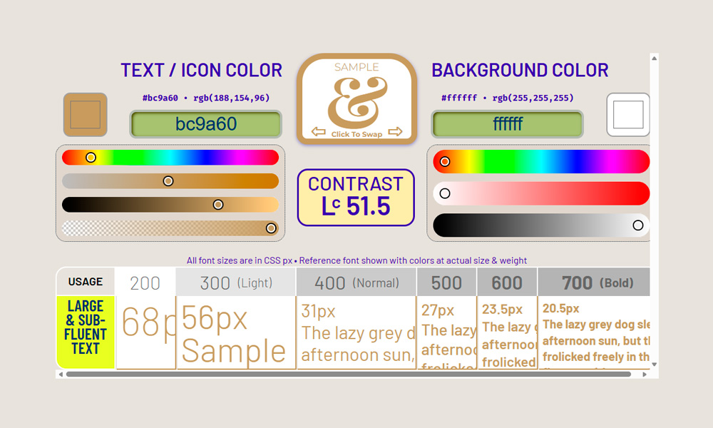 While the body text (#555555) has acceptable contrast, its font weight is not ideal for prolonged reading by an older audience. Additionally, the use of #bc9a60 on a white background yields an Lc of 51.5 under the APCA model, which is deficient for informational text. Proposal: Adjust font weights and darken golden tones on critical elements to ensure visual inclusion.